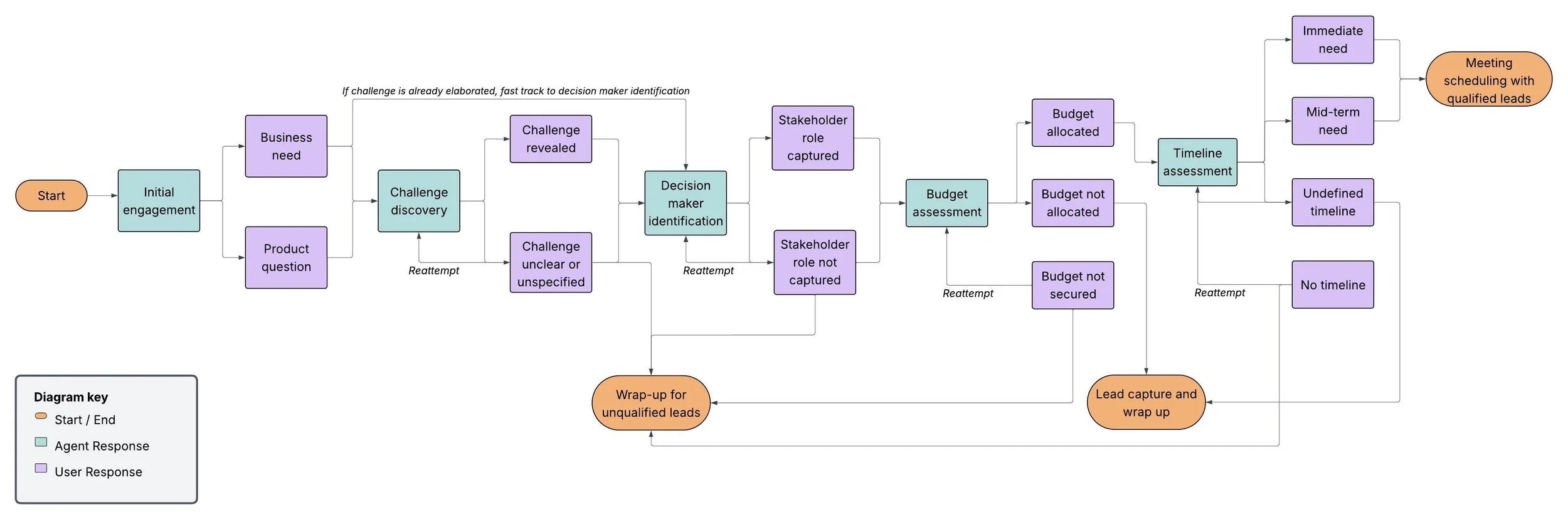 Platform constraints: Agent follows set order of questions (need → authority → budget status → timeline) instead of adapting completely to conversation flow. We plan to improve this in future iterations.